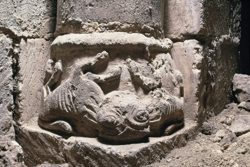 Finally the south wall, the monument’s primary facade, features the building’s two most beautiful column bases. On either side of the staircase leading to the lower room, there is a column base depicting two single-headed lion cubs and another with a two-headed dragon. Some see an illustration of a Biblical reference from Psalm 91 in these sculptures: “thou shalt tread upon the lion and adder: the young lion and the dragon shalt thou trample under feet”.